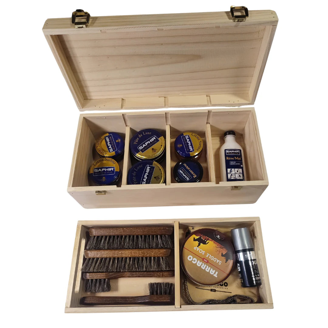 Esta caja valet es la solución perfecta para mantener todos tus productos de cuidado del calzado organizados y al alcance. ¡Añade un toque de sofisticación y orden a tu rutina de cuidado de calzado con esta exquisita caja valet de pino chileno!