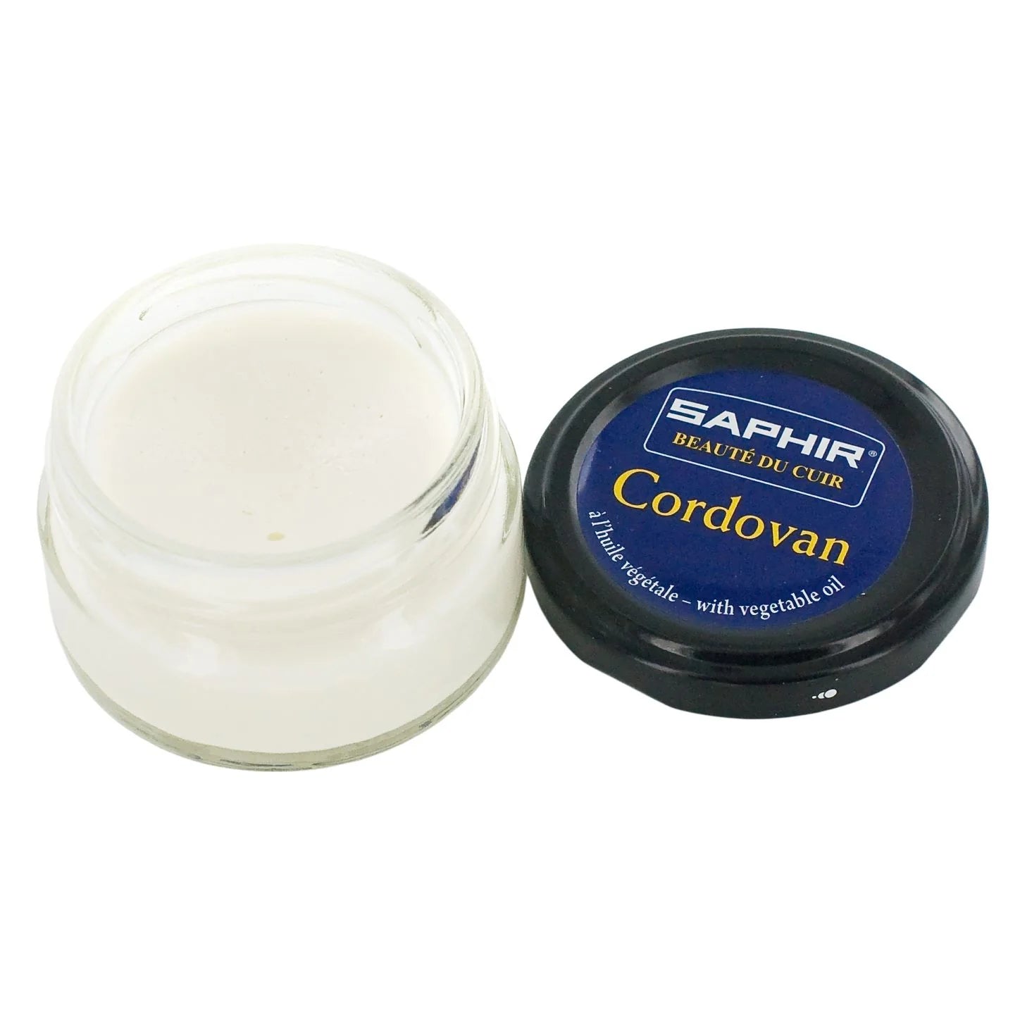 Crema Cordovan de Saphir es una crema en base a cera de abeja, aceite de carnauba y otras ceras nutritivas que contiene una alta concentración de pigmentos. No contiene trementina, lo que permite cuidar de manera adecuada el delicado cuero que es el cordovan.