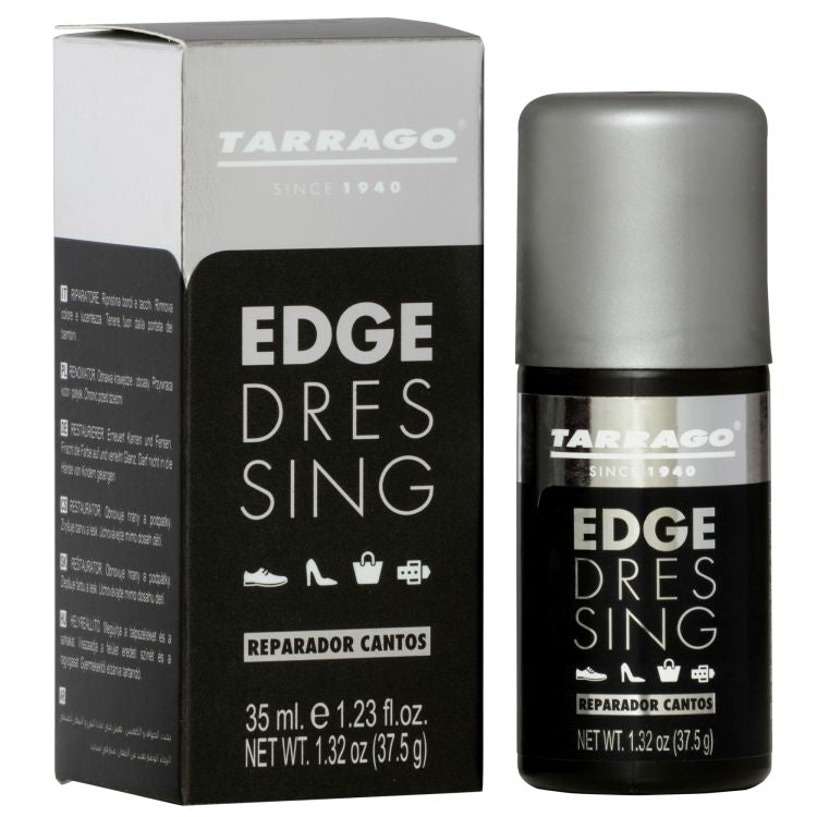 Tarrago Edge Dressing es una tinta especialmente formulada para reparar los daños en los cantos, las suelas y los tacones de los zapatos. Gracias a su formulación con alta concentración de pigmentos, Tarrago Edge Dressing cubrirá ralladuras, rozaduras y arañazos de suelas y tacones proporcionando a la vez un acabado brillante sin necesidad de pulir después de su aplicación.