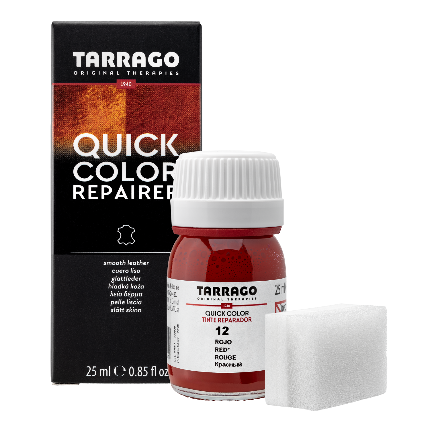 Tarrago Quick Color es un tinte reparador en base acuosa para cuero liso. Su alta concentración de pigmentos de alta calidad proporciona una gran capacidad de cubrición, ayudando a reparar pequeños desperfectos como rozaduras y arañazos causados por el uso diario o desgaste.
